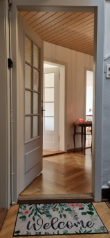 Wenn du vor dem Café stehst, ist der Eingang auf der rechten Seite des Hauses. Bitte klingeln.